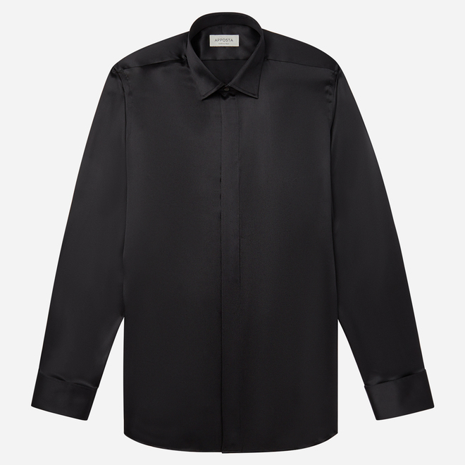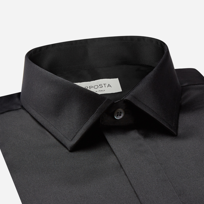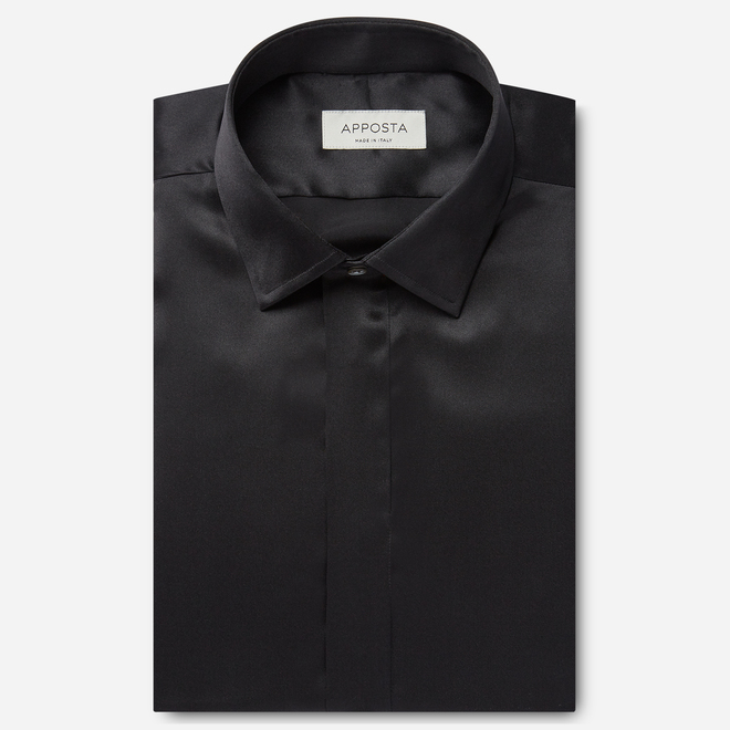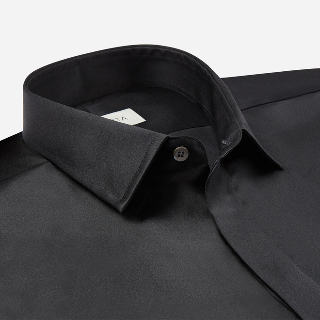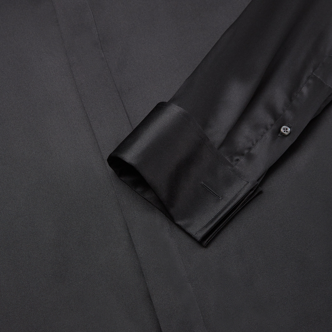 Material:SilkYarn:SingleComposition:100% SilkPattern:SolidColour:BlackWeave:PoplinSeasonality:Spring/SummerWrinkle Resistance:LowIroning Effort:HighPerceived Weight:MediumSoftness:Very SoftShininess:Very shinyLook:OpaqueSmoothness:Extra smoothWashing Instructions:Dry cleaning only -