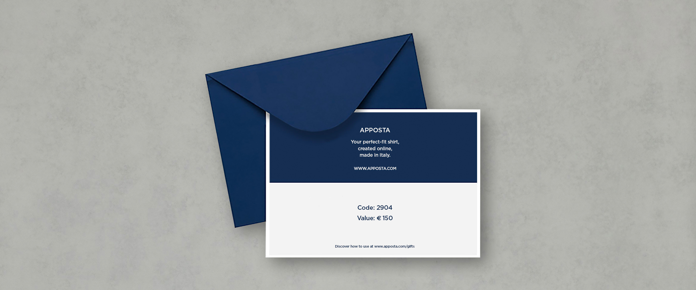 Con la tarjeta-regalo digital de Apposta tendrá la certeza de que el regalo encajará perfectamente con los deseos del destinatario. Usted compra la tarjeta y él diseña una camisa que se adapta perfectamente a su estilo y medida.